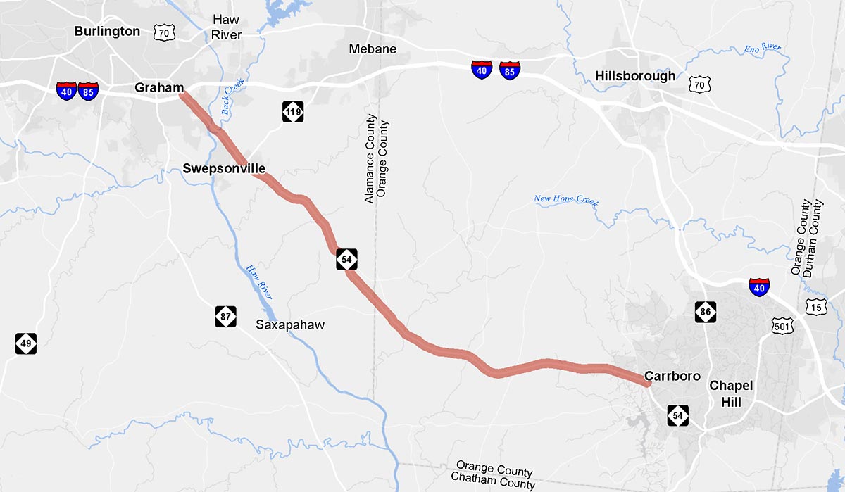 This study of NC 54 West between Old Fayetteville Road in Carrboro and I-85 in Graham is underway to develop a long-term vision for this corridor, including the NC 54 roadway itself and the surrounding communities.  This vision is comprehensive, and seeks to address preservation of the area's character, economic opportunity and vitality, environmental sensitivity, and transportation improvements for all users (drivers, freight, pedestrians, bicyclists, etc.).